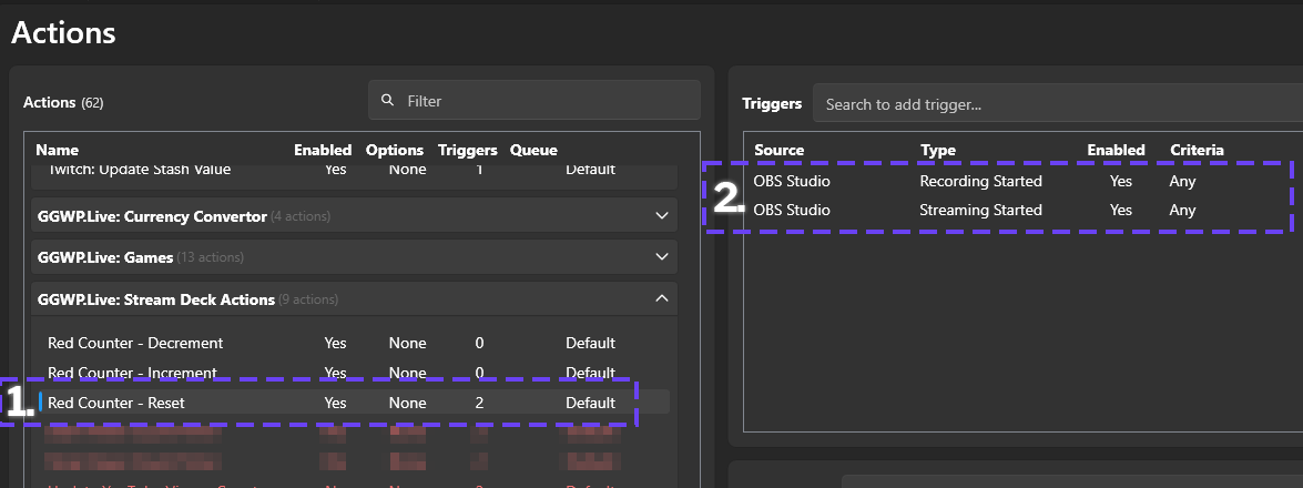 - In Streamer.bot select the "Red Counter - Reset" action and in the Triggers section add triggers for when OBS starts Streaming/Recording
